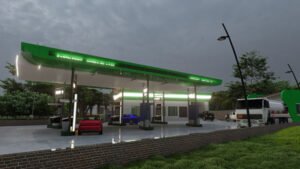 ✅ Modern Forecourt Design – Includes canopy-covered pump areas and safety clearance zones.